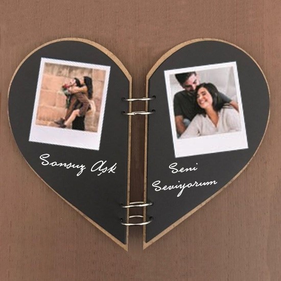 Kalp şeklinde fotoğraf albümü üzerine özel renkli baskı yapılarak ömür boyu kalıcı hale getirilir. Yarım kalp kapak ebatı 16*27 cm dir. 20 adet siyah yaprak bulunmaktadır. Adf malzemeden üretilmiştir Kalp fotoğraf albümünün yalnızca ön ve arka kapak kısmı kişiye özeldir.