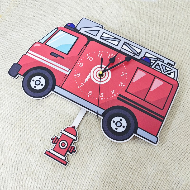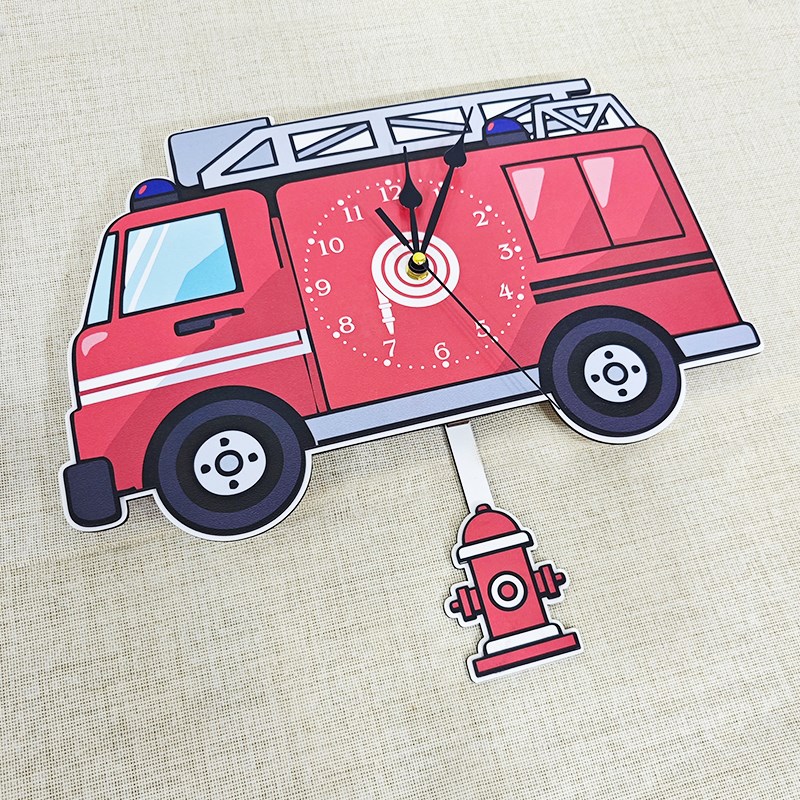40x35 cm ölçülerindetasarlanmış bu duvar saati, 2 katmandan oluşmaktadır. Her biri 3 mm kalınlığında olan MDF tabakalar üzerine yapılan yüksek kaliteli baskı sayesinde ürün hem sağlam hem de dikkat çekici bir görünüm kazanır. Saatin ön yüzeyinde yer alan canlı ve eğlenceli itfaiye detayları, çocukların hayal dünyasını süslerken; alt kısımda sallanarak çalışan sarkaç ise saate eğlenceli bir dinamizm katar.