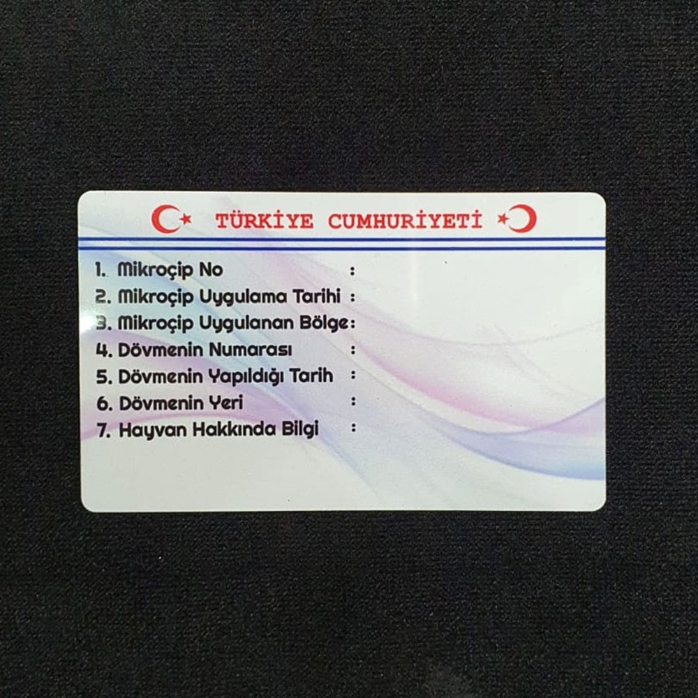 Köpeğinizin cinsine göre pembe ve mavi renk ile hazırlanmaktadır. Köpeğinizin isminin ve resminin yer aldığı, sahibine ait bilgilerle beraber birinci sınıf baskı tekniği kullanılarak hazırlanmaktadır. Arka yüzeyinde köpeğinize ait mikroçip numarası, yeri gibi veya sağlığıyla ilgili bilgileri yazabileceğiniz bir bölüm hazırlanmıştır.